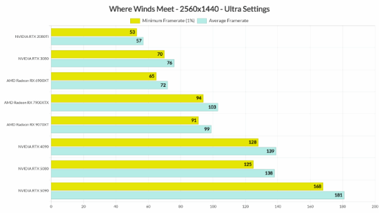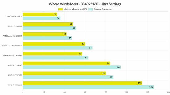 在1440P分辨率+超高画质设置下,唯一无法实现60FPS体验的显卡是NVIDIA RTX 2080Ti。而在原生4K分辨率+超高画质设置下,测试中的三款顶级NVIDIA显卡均能轻松实现60帧以上的运行效果。AMD方面,Radeon RX 7900XTX显卡可达到60FPS体验。若使用FreeSync显示器,AMD Radeon RX 9070XT显卡也能为玩家提供流畅的游戏体验。