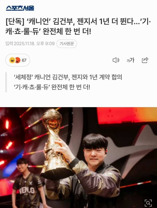 然而让人没想到的是,韩媒《首尔体育》爆料并确认,Canyon金建敷最终与Gen.G达成续约,将以一年合约的形式再战一年。