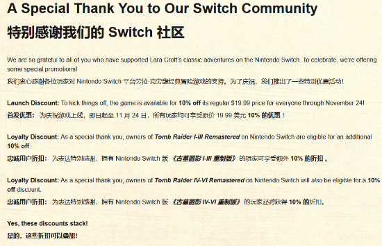 不仅如此,对于已经在Switch上拥有《古墓丽影》重制合集的玩家,还能获得可叠加的忠诚折扣。例如如果你拥有《古墓丽影4-6:复刻版》,还能再享10%折扣,总计20%折扣;而拥有《古墓丽影1-3:复刻版》还能再叠加10%。
