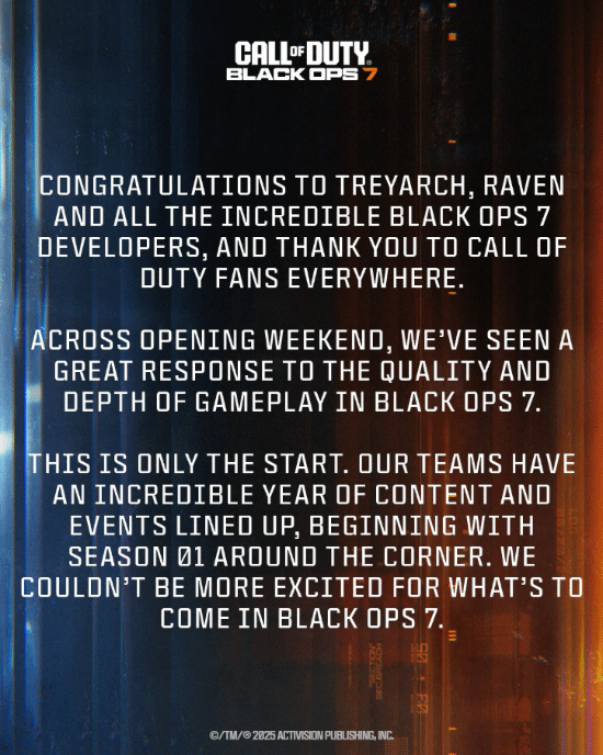 尽管游戏首发状况混乱,动视暴雪却试图在舆论中塑造截然不同的形象。他们近日通过社交媒体发文,祝贺开发团队并感谢玩家对《使命召唤22》“高质量与深度的游戏玩法”所给予的“热烈反响”。