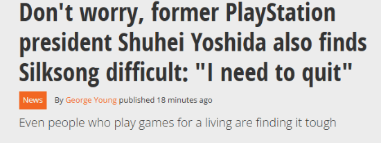 他给出的第一个例子就是《丝之歌》。吉田称赞这款游戏让他不断回去挑战——即便他每次都想放弃。他说到:“我现在正在玩《空洞骑士:丝之歌》。太难了,我一直想着‘我得放弃,这太花时间了’,结果第二天又不由自主地打开继续玩。”