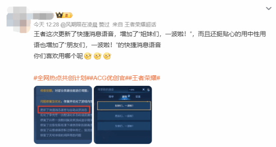 今日,《王者荣耀》更新后补上了“姐妹们一波啦”和“朋友们一波啦”的语音,这也让#王者荣耀#的话题再次登上微博热搜。