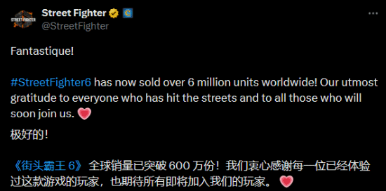 今天早晨,《街头霸王》官方帐户宣布,《街头霸王6》的全球总销量目前已经突破600万!“我们向所有已经踏上街头的玩家,以及即将加入我们的玩家致以最诚挚的感谢。”