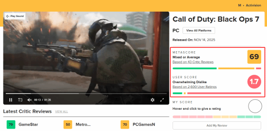 在评分网站Metacritic上,本作的用户评分也持续稳定在惨淡的1.7分(满分10分),使其成为《使命召唤》系列有史以来口碑最差的一作。媒体平均分也从最初的83分下滑至70分,跌出了“好评(绿色)”区间,显示出越来越多媒体的看法与玩家趋于一致。