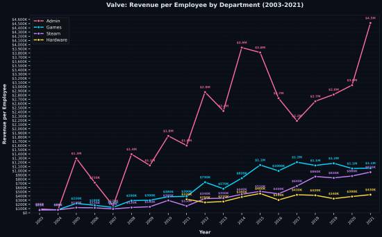 根据数据分析网站Menlo Ventures分析师Didi Das的最新估算,V社去年创造了超过170亿美元的收入(大约为人民币1208亿元),而员工总数仅为336人。这一数字使Valve成为全球IT行业最具生产力的公司之一,其人均收入超过5000万美元!