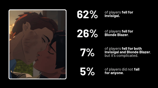 AdHoc工作室本周发布数据视频庆祝游戏收官。统计显示:高达62%的玩家选择了"隐形女"感情线,而仅有26%的玩家最终与"金耀光"修成正果。另有7%的玩家脚踏两条船,还有5%的玩家没与任何角色恋爱。