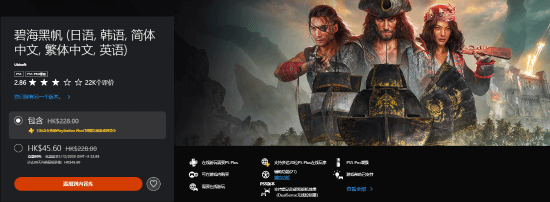 育碧4A级大作《碧海黑帆》在PS Store迎来史低骨折!原价228港元的标准版,2折优惠后仅需45.6港元即可入手,比80美元(568港元)的3A大作便宜了不少。