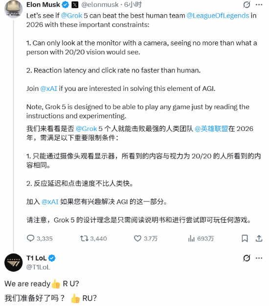 11月25日,全球首富Elon Musk在X平台更新推文,宣布旗下AI平台(Grok5)将在未来挑战一支顶尖《英雄联盟》人类战队。