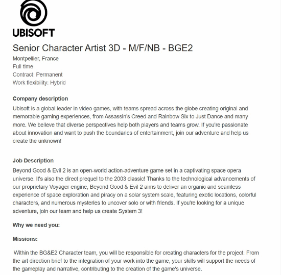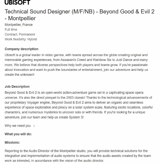 根据外媒Tech4Gamers发现的多个招聘启事(包括技术音效设计师与资深角色美术师岗位)显示,《超越善恶2》的发售可能仍需数年时间,目前游戏尚未进入最终打磨阶段,开发进度似乎仍处于中期阶段。