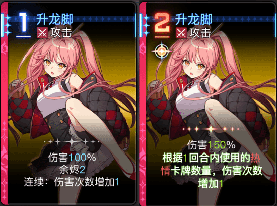 以“美菱”这位角色举例,其“升龙脚”卡牌在获得特定的「卡牌闪光」后,可以基于当前回合所使用的“热情”属性卡牌数量,增加卡牌的攻击次数。目前经过玩家开发,在搭配以“维罗妮卡”等具有强力过牌属性的角色卡组构筑下,甚至可以实现一回合万伤“升龙脚”,这些都是可以不用氪金就能实现的。