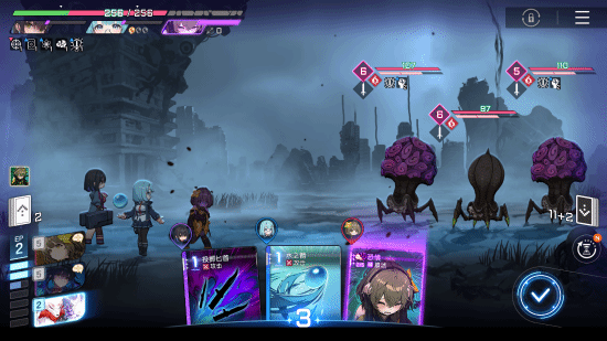 在与卡厄思怪物战斗的过程中,主战员的“精神状态”也是玩家在打牌外重点需要关注的。每一位主战员头像隔壁会有一管紫色的「压力」条,「压力」条会随着每回合的流逝、战斗承受攻击以及随机事件的特殊效果而增加。