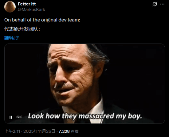 近日,原版《哥特王朝》系列的动画师、建模师Markus Kark也在社交媒体上用一张经典的meme评价了此次事件,并配文“谨以代表原开发团队”,图片内容是经典电影《教父》当中由马龙·白兰度饰演的初代教父维托·柯里昂揭开惨死长子桑尼的裹尸布时的台词:“看看他们是怎么残害我的孩子的?”