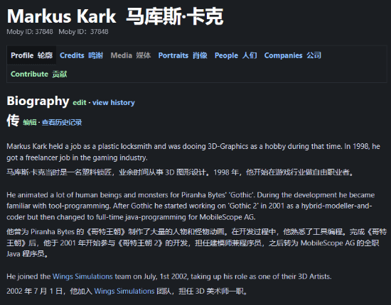 根据Moby Games的介绍,Markus Kark在原版《哥特王朝》当中制作了大量人物和怪物的动画,并在随后的《哥特王朝2》中担任类似“建模师兼程序员”的混合角色。