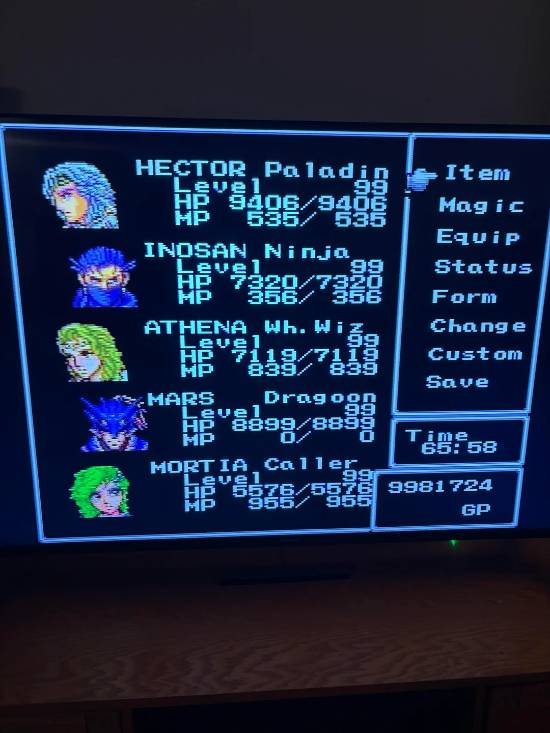 这张珍贵的SNES卡带不仅成功启动,还顺利加载了ST_Lawson父亲上次离开时的进度。游戏中的主角队伍正处于满级状态——99 级。