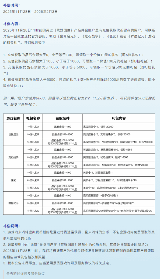 感谢一直以来支持《荒野国度》游戏的广大玩家,自停运公告发布之日起至2026年01月27日11时止,现有玩家游戏账号中尚未使用的货币仍可继续使用,我们将通过游戏内邮件额外补偿10000流晶,希望各位能继续在游戏中欢享快乐生活。