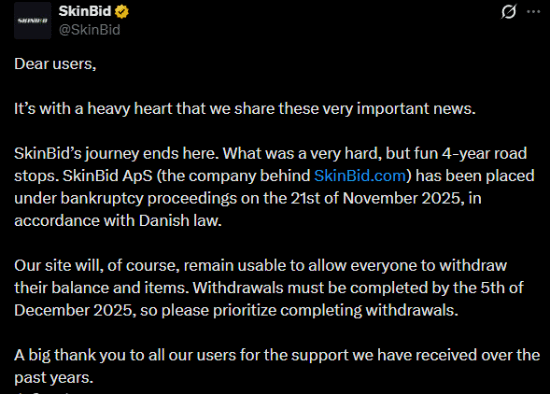 怀着沉重的心情,我们向大家分享这一重要消息。SkinBid 的旅程到此结束。艰难但愉快的四年走到了终点。SkinBid ApS(运营 SkinBid.com 的公司)已于 2025 年 11 月 21 日根据丹麦法律进入破产程序。